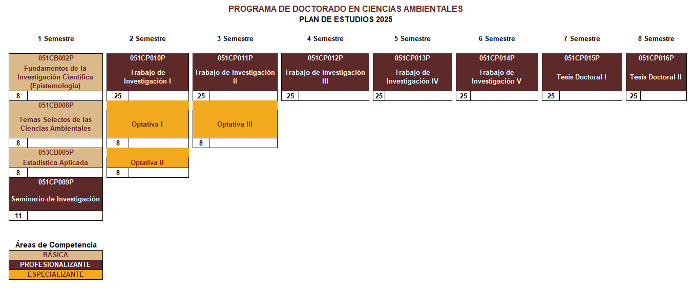 El Doctorado en Ciencias Ambientales de la UES ofrece una malla curricular cuyos aspectos formativos se logran mediante tres núcleos de competencias: